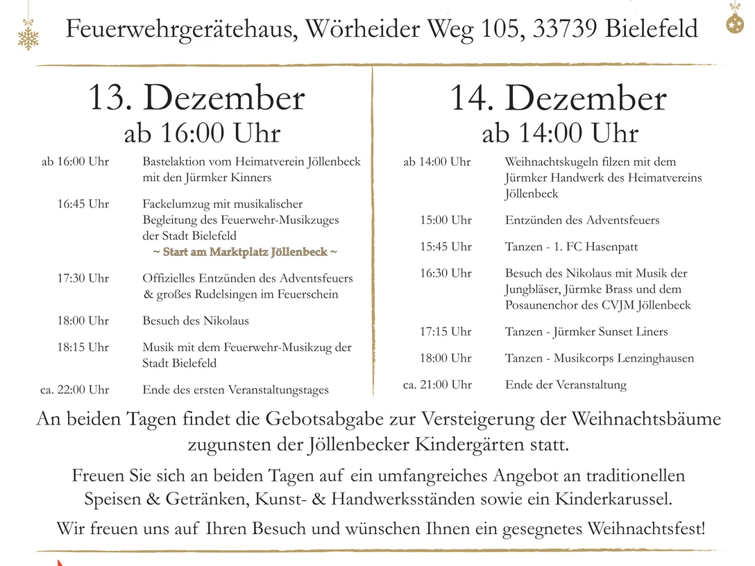 Am Feuerwehrgerätehaus Jöllenbeck, Wörheider Weg 105, erwartet euch ein festliches Wochenende mit Musik, Tanz, Handwerk & Leckereien.