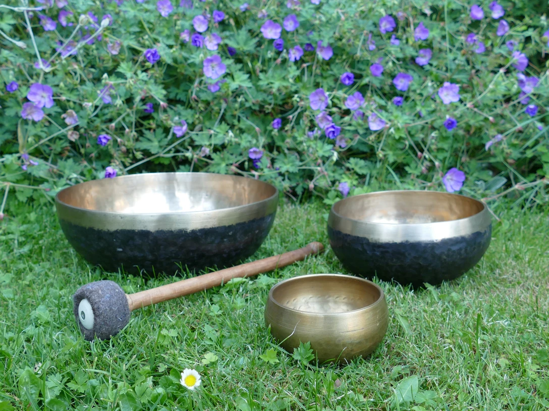 Zum Teil begleite ich die langsamen, fließenden Bewegungen des Qigong mit Klangschalen.